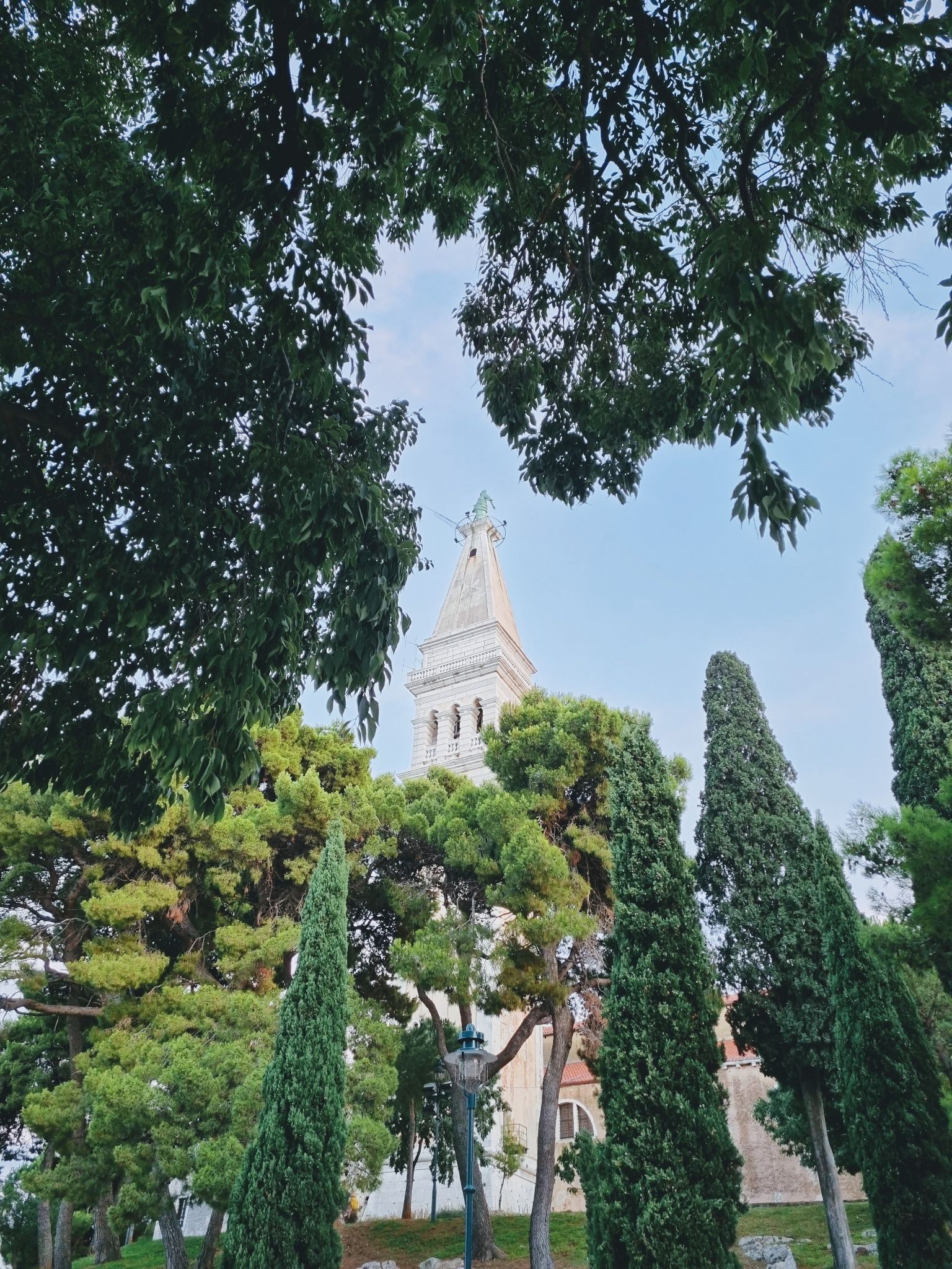 At the top stands a copper statue of Saint Euphemia, crafted in the eighteenth century by Venetian master Zuan Battista Bonazza. The statue rotates with the wind, quietly overlooking the town and the Adriatic Sea.